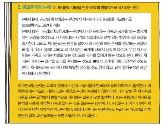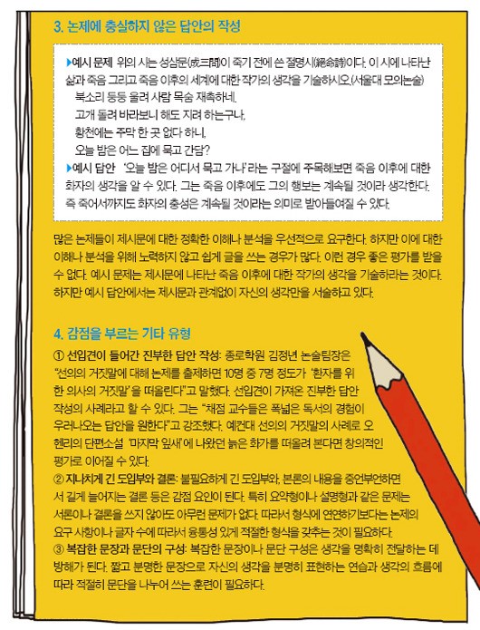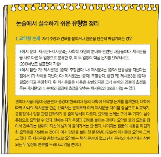 “요즘 논술은 답이 있는 논술입니다. 그만큼 기본을 지키는 것이 중요하다는 의미죠.” 김 팀장은 “수험생들이 논제가 요구하는 기본을 지키지 않아 실수와 감점을 당하는 경우가 생각 외로 많다”고 지적했다. 그는 “요약하기와 같은 문제유형에서 30% 이상의 수험생들이 자기 견해와 주장을 담는 실수를 반복한다”고 말했다. 요약은 글의 요점을 간추리는 객관적인 글쓰기인 만큼 논제에서 담고 있는 내용과 주장을 벗어나서는 좋은 평가를 받을 수 없다. 김 팀장은 “논술은 자신이 쓰고 싶은 글을 쓰는 게 아니라 논제에서 하라는 대로 서술하는 글쓰기”라고 강조했다. 이를 위해선 자신이 지원하고자 하는 대학에서 발행한 논술 가이드나 논술 동영상을 토대로 대학이 강조하는 부분을 살펴보는 것이 필요하다.